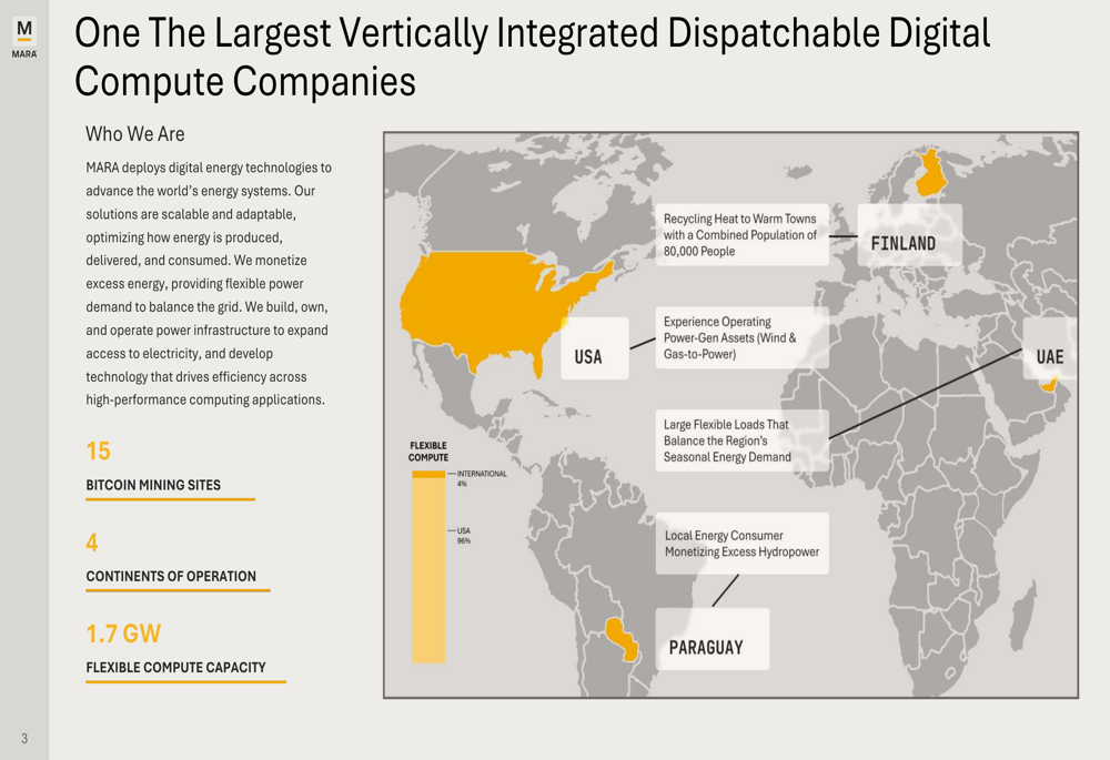 Marathon Digital positioned itself as "One of the Largest Vertically Integrated Dispatchable Digital Compute Companies" with operations spanning four continents. The presentation highlighted that 96% of the company’s flexible computing locations are in the USA, with the remaining 4% distributed internationally across Finland, Paraguay, and the UAE.