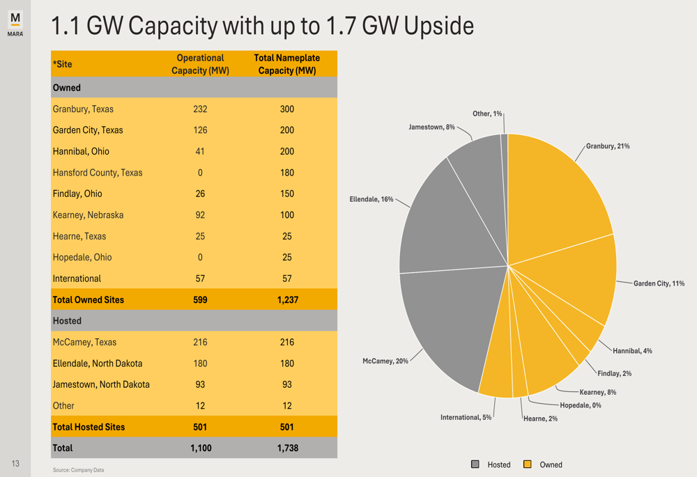 The company detailed its current power capacity, reporting 1.1 GW operational and 1.738 GW nameplate capacity across owned and hosted sites. Marathon noted a transition from 0% to 70% owned and operated sites, reflecting its strategic shift toward vertical integration: