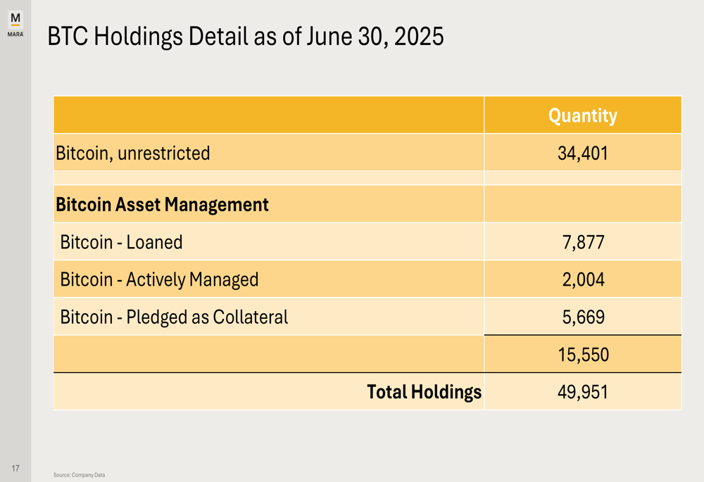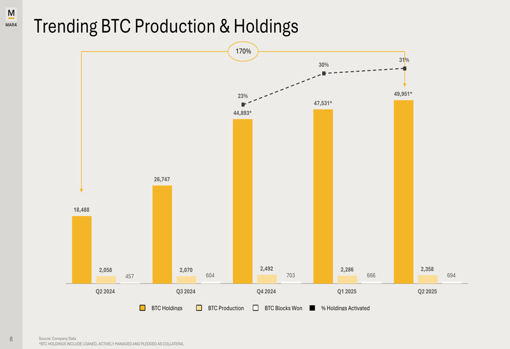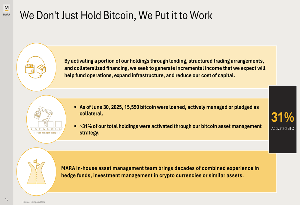 Marathon Digital detailed its approach to Bitcoin asset management, noting that 31% of its total holdings (15,550 BTC) were being activated through loans, active management, or as collateral. The company stated this strategy helps generate incremental income to fund operations, expand infrastructure, and reduce capital costs.