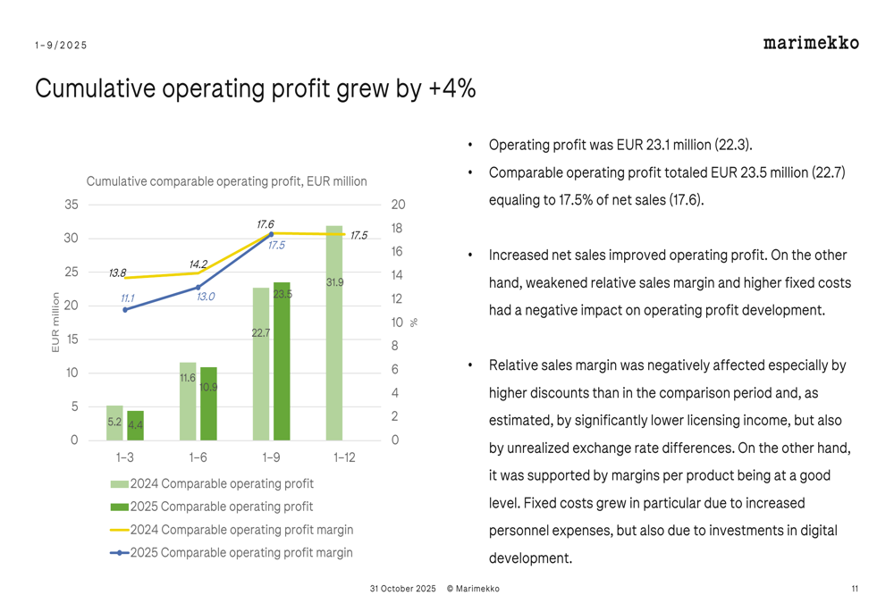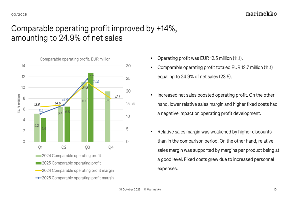 Marimekko's comparable operating profit for Q3 2025 represented 24.9% of net sales, demonstrating the company's strong profitability. The quarterly operating profit growth is illustrated in this chart: