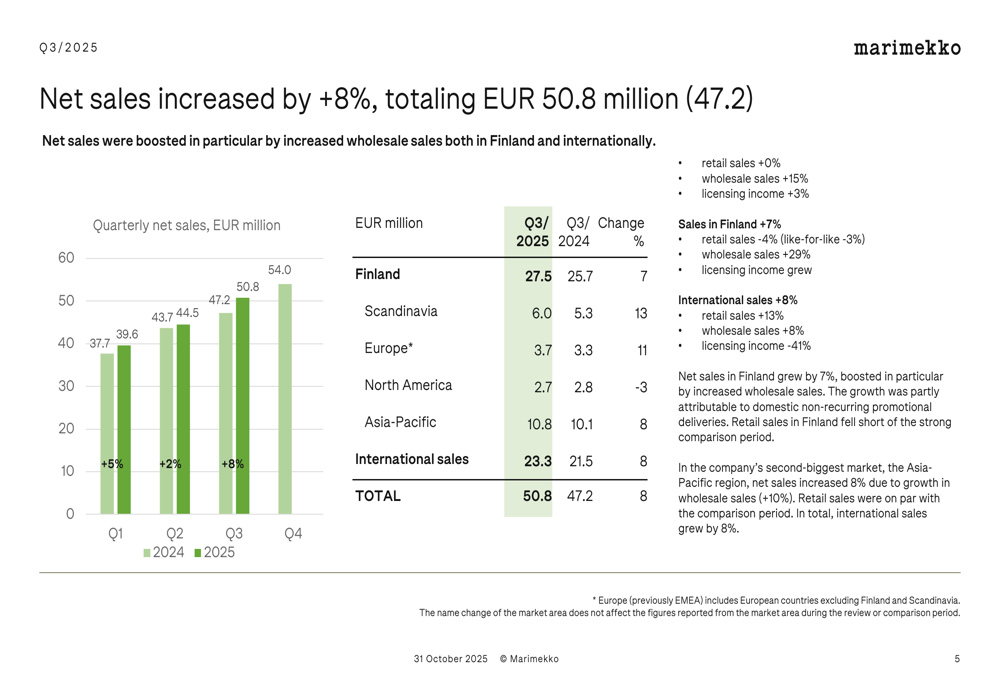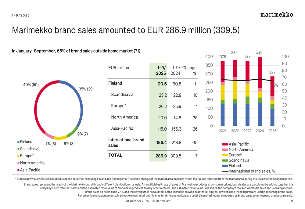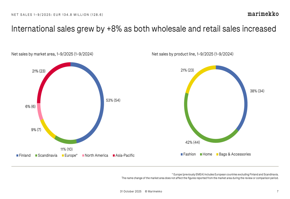 Marimekko's international expansion strategy continues to yield results, with international sales growing 8% in both the third quarter and the nine-month period. The Asia-Pacific region remains the company's largest international market, accounting for 53% of international sales in the first nine months of 2025.