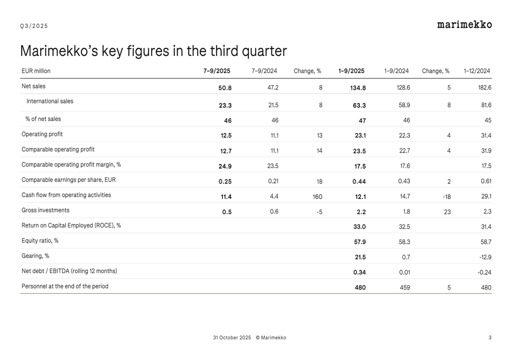 Marimekko's net sales rose to €50.8 million in Q3 2025, compared to €47.2 million in the same period last year. The growth was primarily driven by increased wholesale sales both in Finland and international markets. The company's comparable operating profit improved by 14% to €12.7 million, representing a robust margin of 24.9% of net sales, up from 23.5% in Q3 2024.