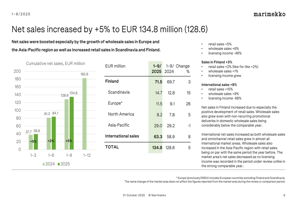 For the first nine months of 2025, Marimekko reported cumulative net sales of €134.8 million, a 5% increase from €128.6 million in the comparable period. The company's international sales grew by 8% during this period, while sales in Finland increased by 3%.