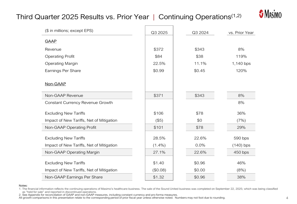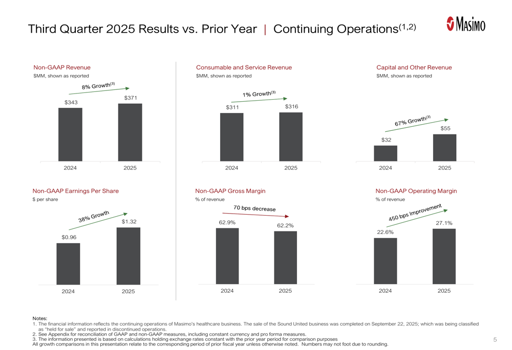 Masimo reported non-GAAP revenue of $371 million for Q3 2025, representing 8% growth on a constant currency basis compared to the same period last year. Non-GAAP operating profit reached $101 million, a 29% increase, while earnings per share jumped 38% to $1.32.