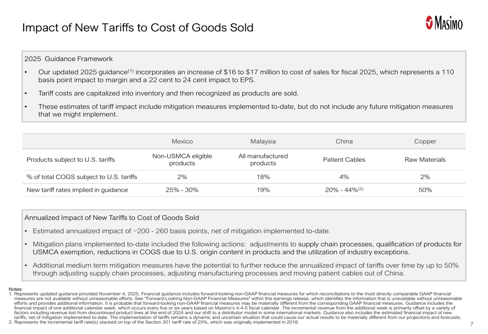 Masimo outlined several mitigation strategies already implemented, including supply chain process adjustments, qualification of products for USMCA exemption, and reductions in cost of goods sold. The company indicated that additional mitigation measures could potentially reduce the annualized impact of tariffs by up to 50% over time.