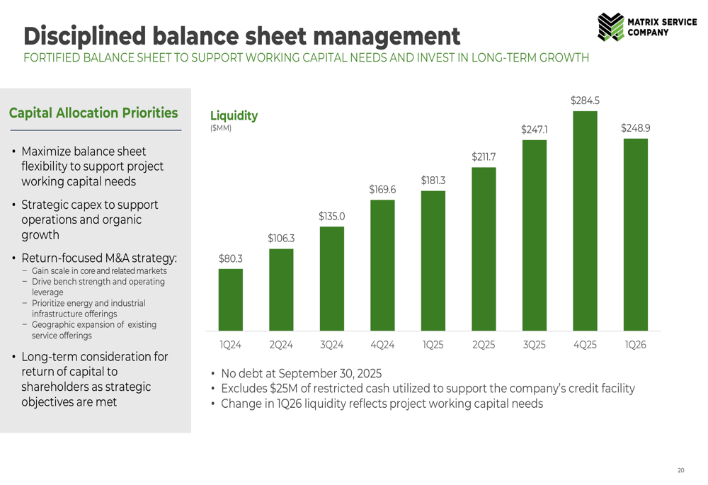 From a balance sheet perspective, Matrix Service maintains a strong financial position with $248.9 million in liquidity and no outstanding debt. This represents a significant improvement from $181.3 million in Q1 FY25, though it decreased slightly from $284.5 million in Q4 FY25 due to project working capital needs.
