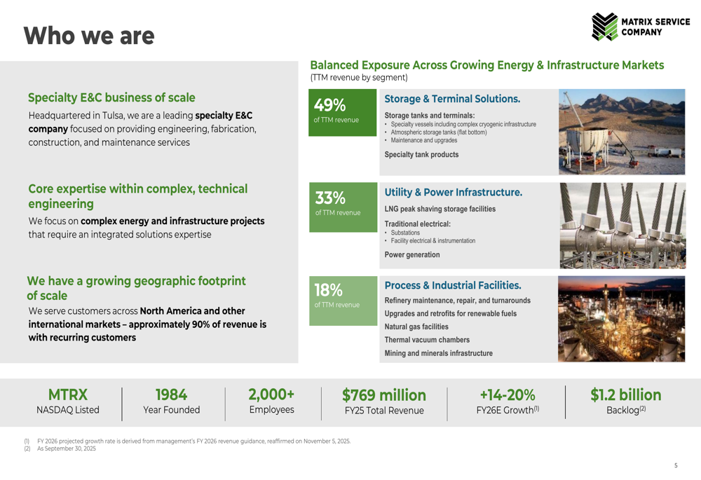 Matrix Service is positioning itself across three core business segments, with Storage & Terminal Solutions representing the largest portion at 49% of trailing twelve-month revenue, followed by Utility & Power Infrastructure at 33% and Process & Industrial Facilities at 18%.