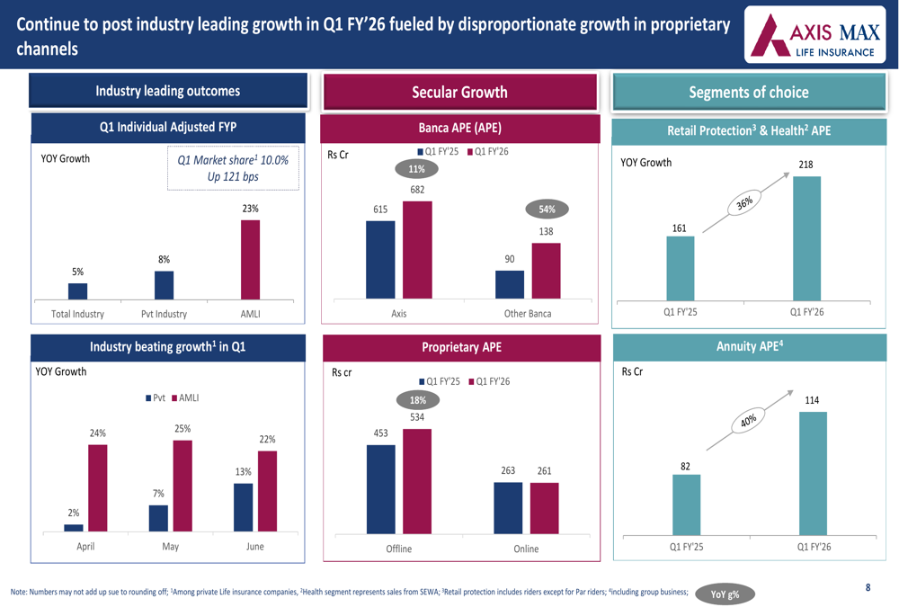 The improvement in margins was primarily driven by strong growth in high-margin protection and annuity products. Retail Protection and Health APE grew by 36% to Rs 218 crore, while Annuity APE increased by 40% to Rs 114 crore during the quarter.