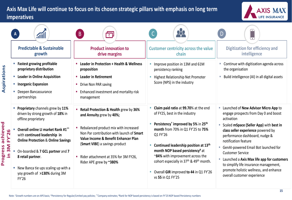 Max Financial continues to execute its strategy based on four key pillars: predictable and sustainable growth, product innovation to drive margins, customer centricity, and digitization for efficiency. The company is particularly focused on expanding its distribution capabilities through both proprietary and bancassurance channels.