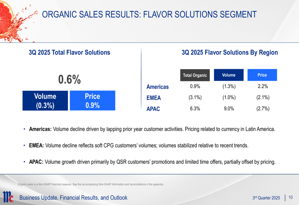 The Flavor Solutions segment faced greater challenges, particularly in EMEA where organic sales declined 3.1%, reflecting soft volumes from CPG customers. The APAC region was the bright spot, growing 6.3% on strong QSR customer promotions and limited-time offers.