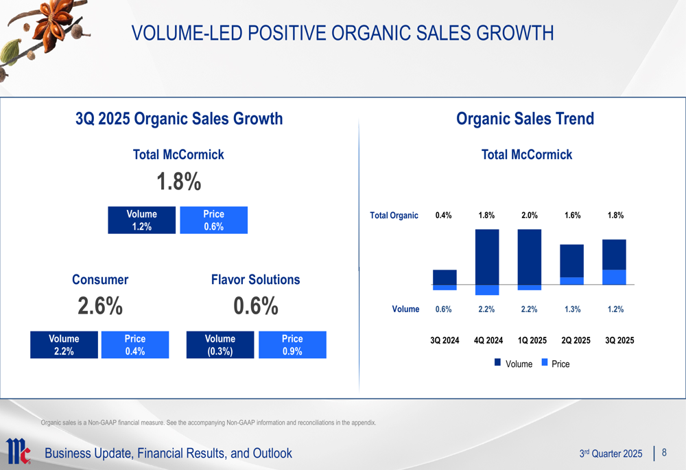McCormick & Company (NYSE:MKC) presented its third-quarter 2025 results on October 7, highlighting volume-led growth despite ongoing challenges from tariffs and commodity costs. The spice and flavoring manufacturer reported modest organic sales growth of 1.8%, driven primarily by volume increases rather than pricing actions.