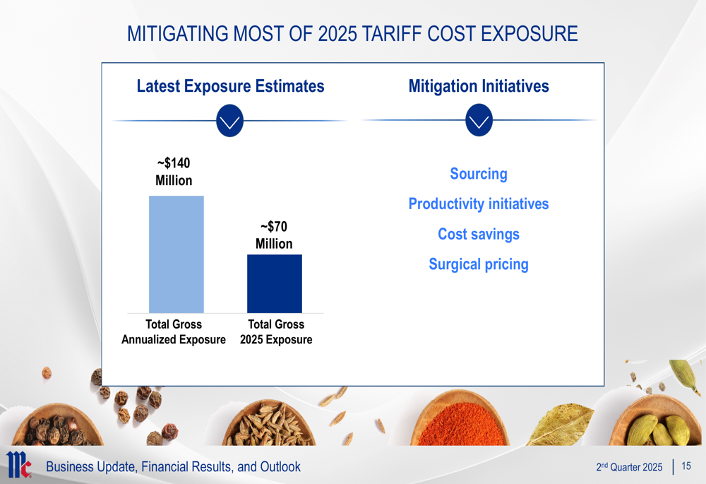 A significant focus of the presentation was McCormick’s approach to managing tariff impacts. The company faces approximately $140 million in annualized tariff exposure, with about $70 million impacting 2025 results.