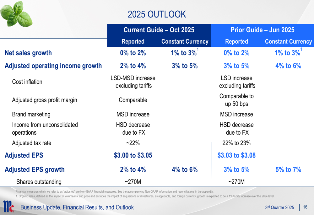 McCormick maintained its cautious outlook for 2025, projecting net sales growth of 0-2% and adjusted operating income growth of 2-4%. This represents a slight tightening from the 1-3% sales growth guidance mentioned in the Q2 earnings report.