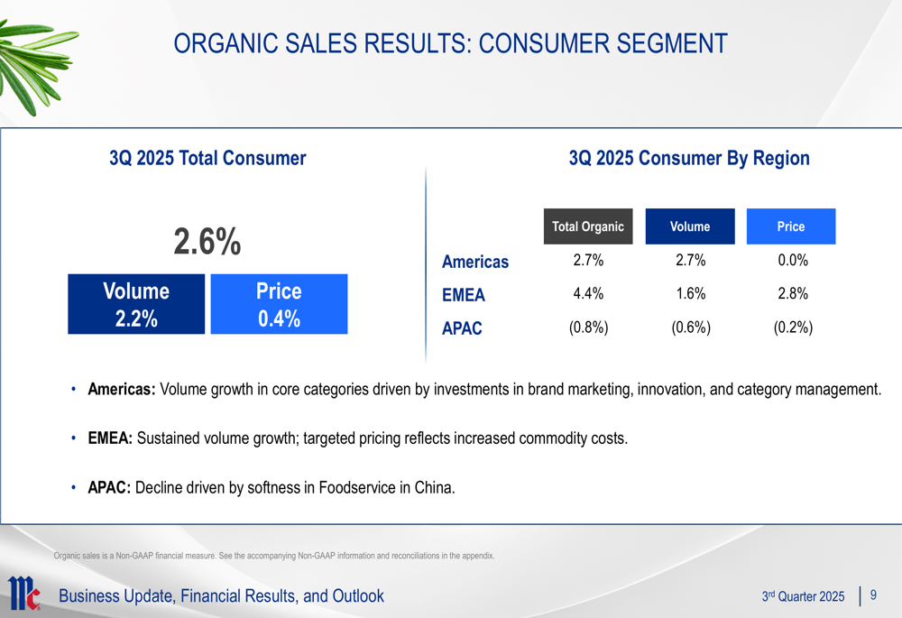 McCormick’s performance showed significant variation across segments and regions. The Consumer segment outperformed Flavor Solutions, with organic sales growth of 2.6% compared to just 0.6% for Flavor Solutions.