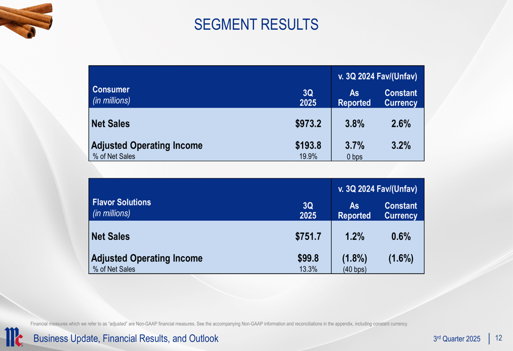 McCormick reported net sales of $1,724.9 million for Q3 2025, representing 2.7% growth on a reported basis and 1.8% in constant currency. The company achieved adjusted earnings per share of $0.85, a modest improvement from $0.83 in the same period last year.