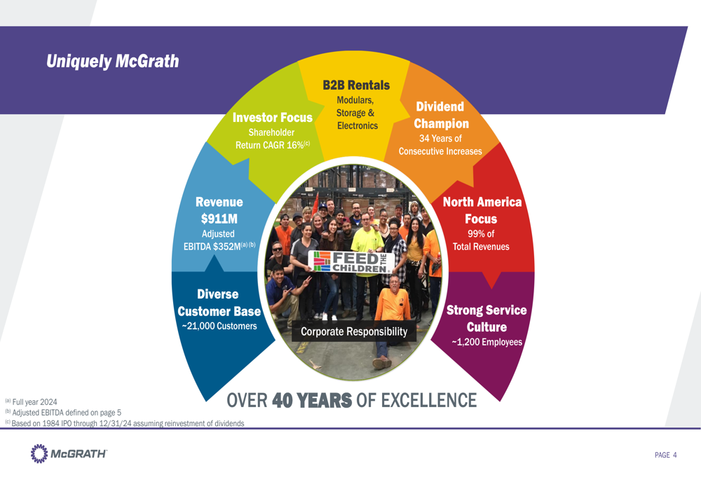 The B2B rental company, which focuses on modulars, storage, and electronics equipment, continues to leverage its strong North American presence, with 99% of revenues generated in this market. McGrath maintains a diverse customer base of approximately 21,000 clients and has positioned itself as a "Dividend Champion" with 34 consecutive years of dividend increases.
