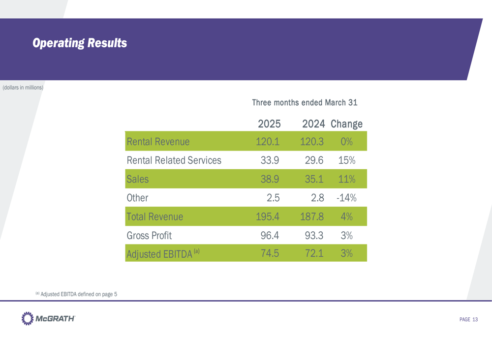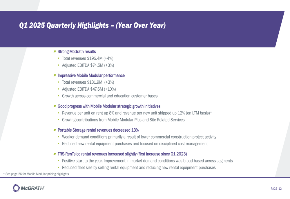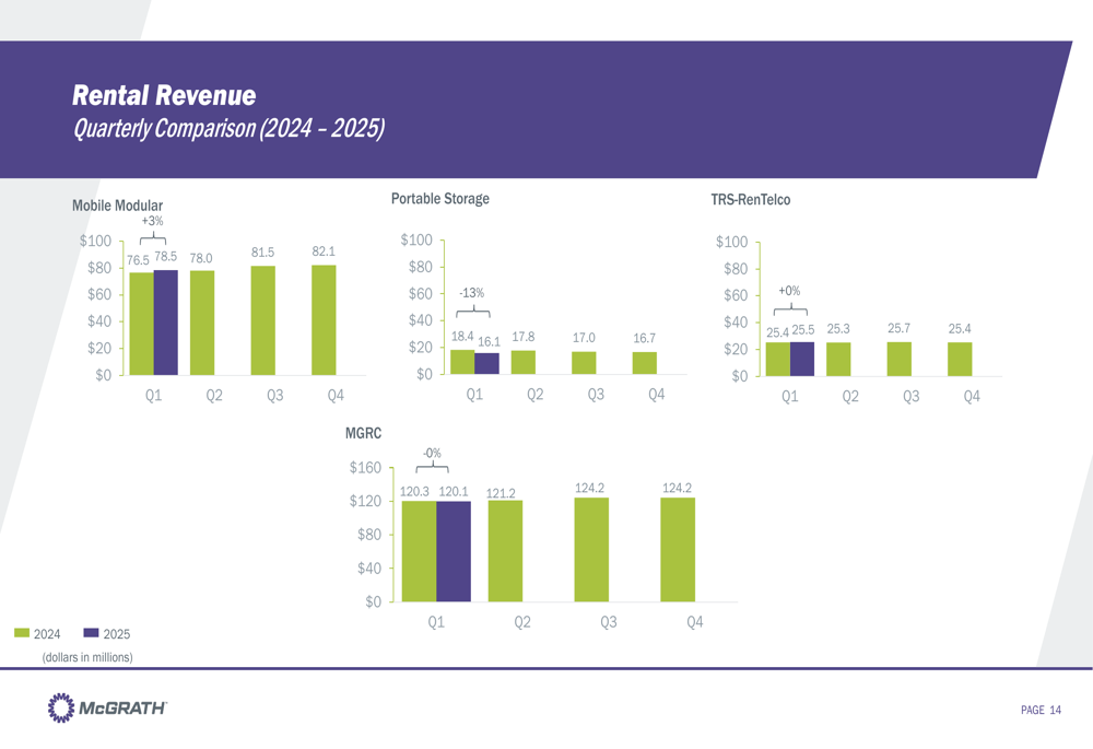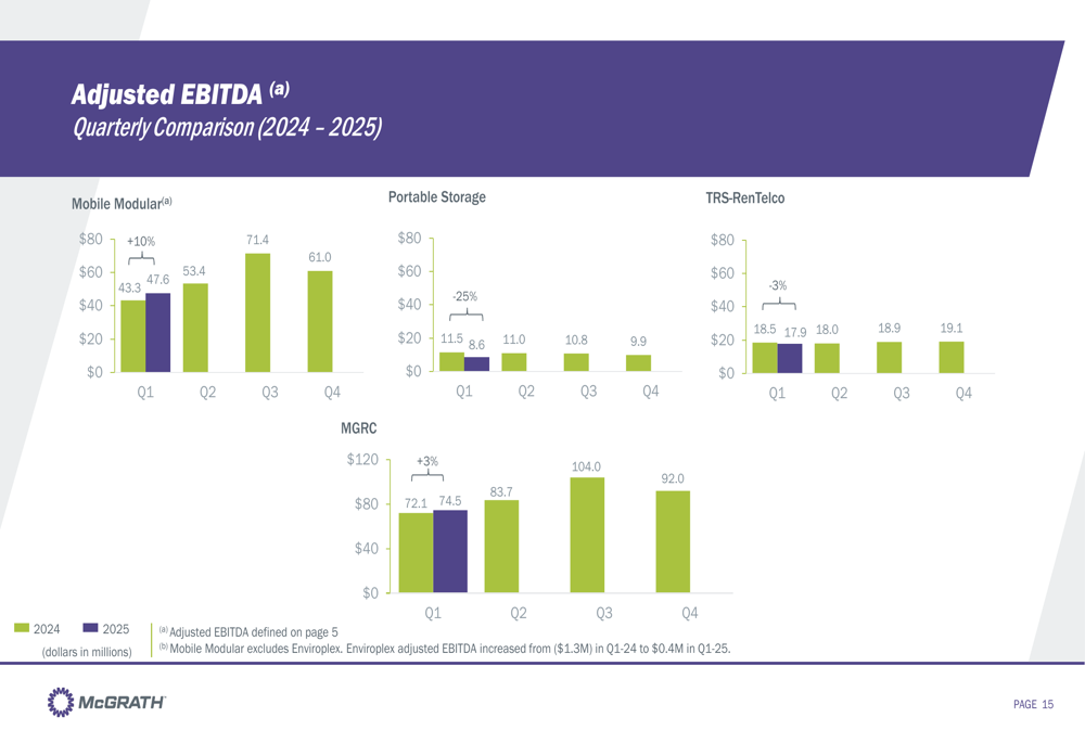 McGrath’s Q1 2025 results demonstrated resilience in a challenging economic environment, with total revenues increasing to $195.4 million (+4% YoY) and adjusted EBITDA rising to $74.5 million (+3% YoY). The company’s performance was primarily driven by the Mobile Modular segment, which offset weakness in the Portable Storage business.