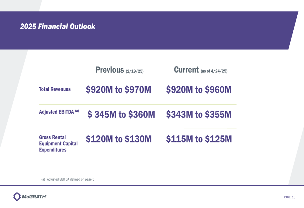 McGrath slightly adjusted its 2025 financial outlook compared to previous projections shared in February. The company now expects total revenues between $920 million and $960 million (down from $920-$970 million) and adjusted EBITDA between $343 million and $355 million (down from $345-$360 million). Gross rental equipment capital expenditures are projected to be $115-$125 million, reduced from the previous estimate of $120-$130 million.