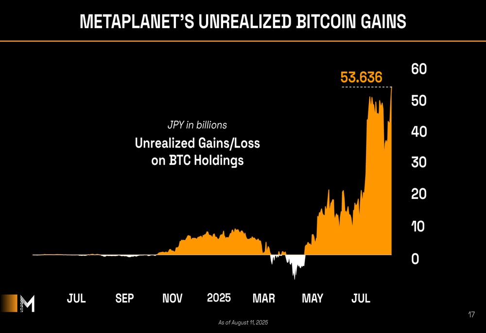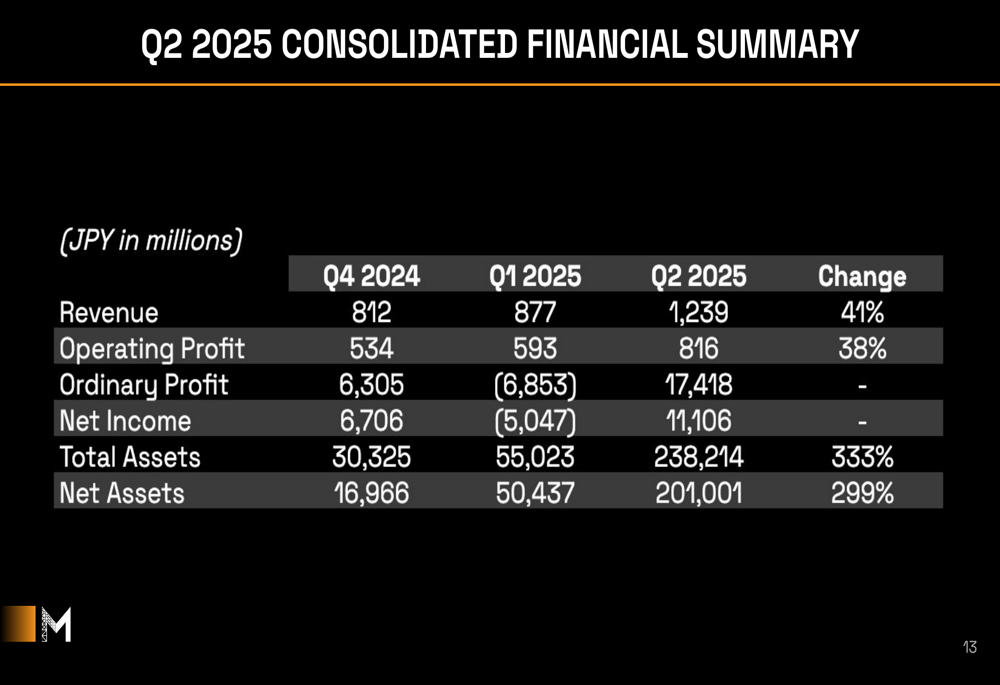 Metaplanet reported impressive financial results for Q2 2025, with revenue reaching ¥1,239 million, a 41% increase from Q1 2025. Operating profit grew to ¥816 million, up 38% quarter-over-quarter. The company achieved a dramatic turnaround in ordinary profit, posting ¥17,418 million compared to a loss of ¥6,853 million in the previous quarter.