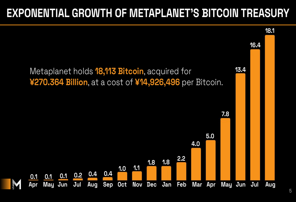 The presentation highlighted Metaplanet’s aggressive Bitcoin accumulation strategy, which has propelled the company to become the fourth-largest corporate Bitcoin holder globally and the largest in Asia. This approach appears to be resonating with investors, as the company reported a 100x market cap increase since adopting its "Bitcoin Standard" on April 8, 2024.
