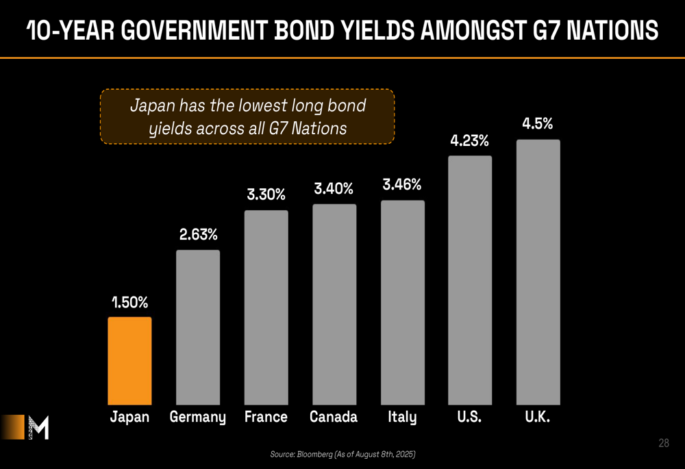 The following chart highlights Japan’s position as having the lowest 10-year government bond yields among G7 nations, creating an opportunity for Metaplanet’s higher-yield offerings: