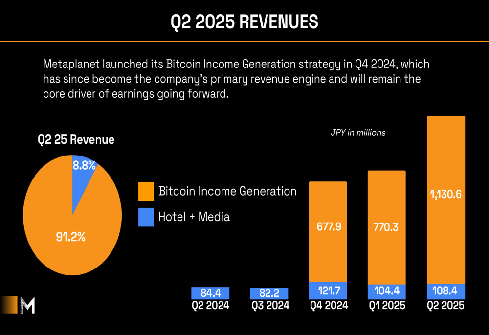 Revenue composition has shifted dramatically toward Bitcoin-related activities. Bitcoin Income Generation now accounts for 91.2% of total revenue, with the company’s legacy Hotel and Media businesses contributing just 8.8%. This transformation reflects Metaplanet’s strategic pivot to becoming primarily a Bitcoin treasury company.