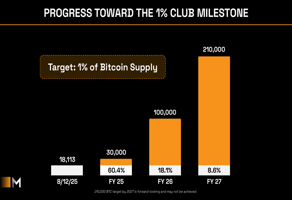 Metaplanet’s presentation emphasized its ambitious goal to accumulate 1% of the total Bitcoin supply (210,000 BTC) by 2027. The company has outlined a phased approach, targeting 100,000 Bitcoin by FY2026 and the full 210,000 by FY2027.