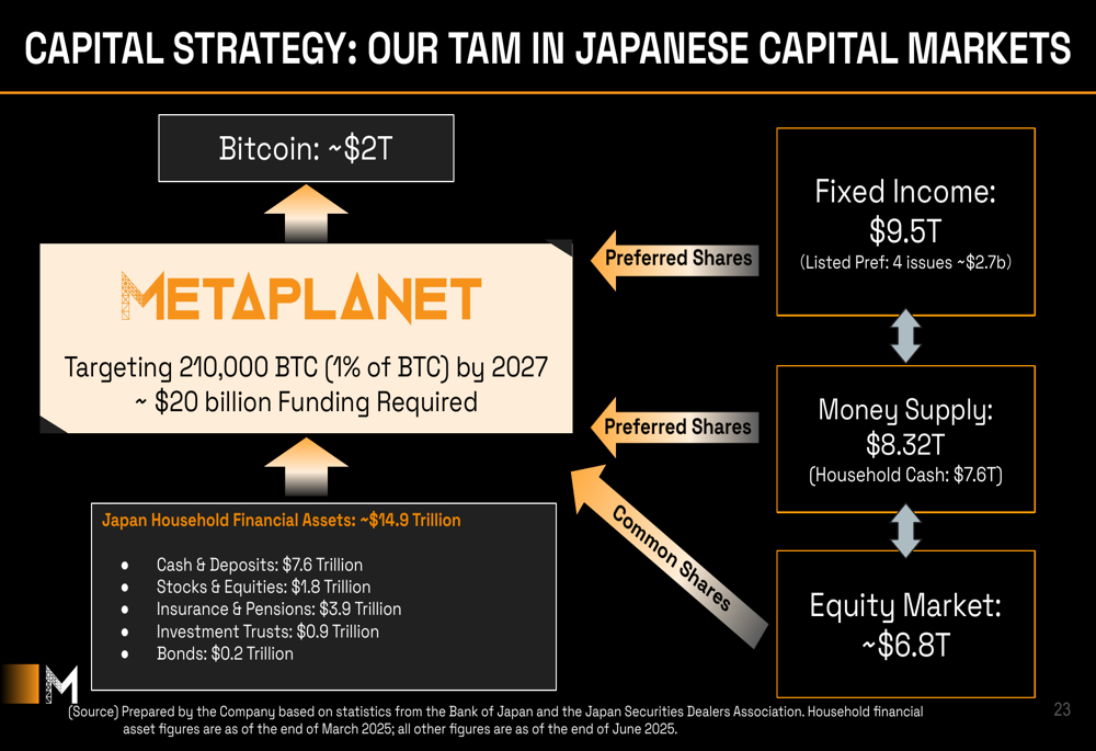 Metaplanet’s management has outlined an ambitious vision to "transform Japan’s multi-trillion dollar fixed income capital market into a Bitcoin accumulation engine." The company sees its total addressable market (TAM) as encompassing Japan’s ¥9.5 trillion fixed income market, ¥8.32 trillion money supply, and ¥6.8 trillion equity market.