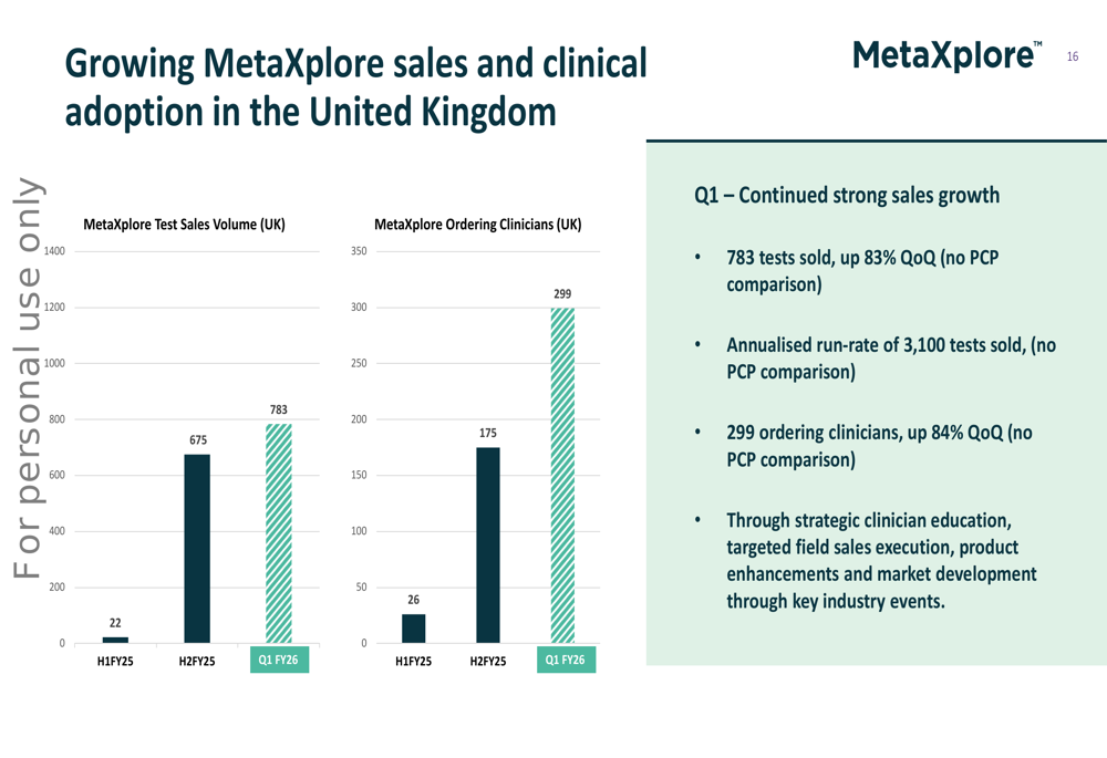 In the United Kingdom, MetaXplore test sales reached 783 in Q1, up 83% quarter-over-quarter, with an annualized run-rate of over 3,100 tests. The UK market has seen ordering clinicians increase by 84% to 299.
