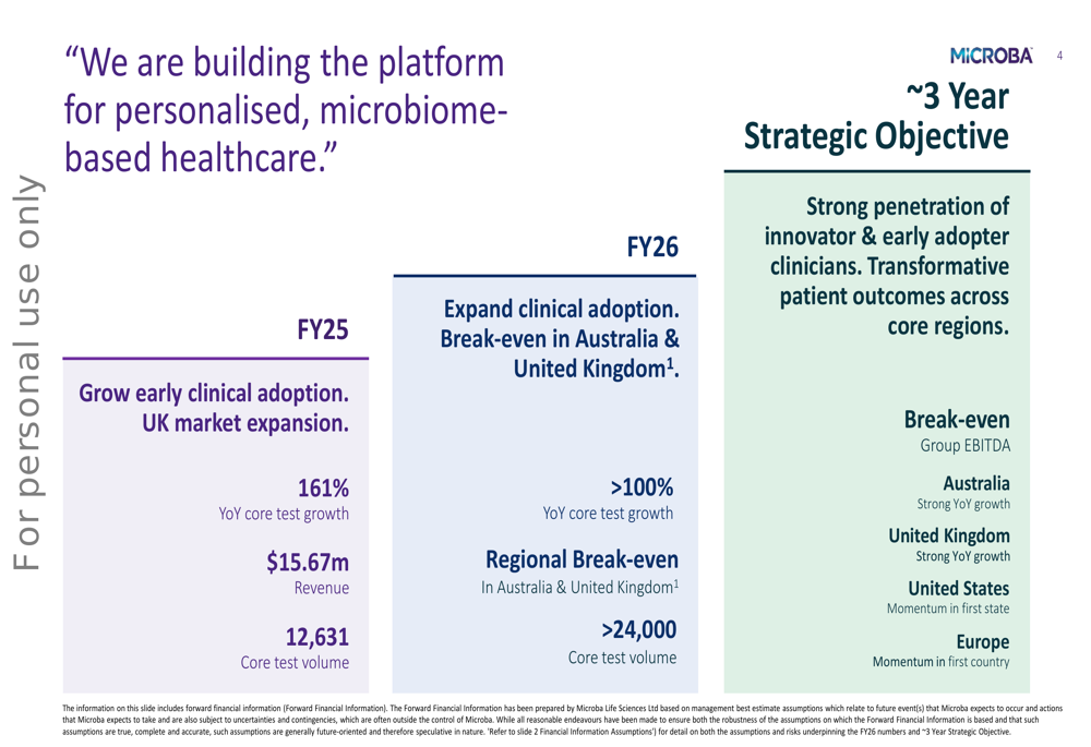 Microba has outlined clear strategic objectives for FY26, targeting regional break-even in Australia and the United Kingdom with over 24,000 core test volume. The company’s three-year strategic objective includes achieving strong penetration of innovator and early adopter clinicians, delivering transformative patient outcomes across core regions, and reaching group EBITDA break-even.