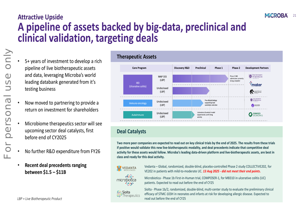 On the therapeutics front, Microba has transitioned from R&D to a partnering focus, with no further R&D expenditure planned from FY26. The company has highlighted upcoming sector deal catalysts expected before the end of CY2025, with recent deal precedents in the sector ranging between $1.5 billion and $11 billion.