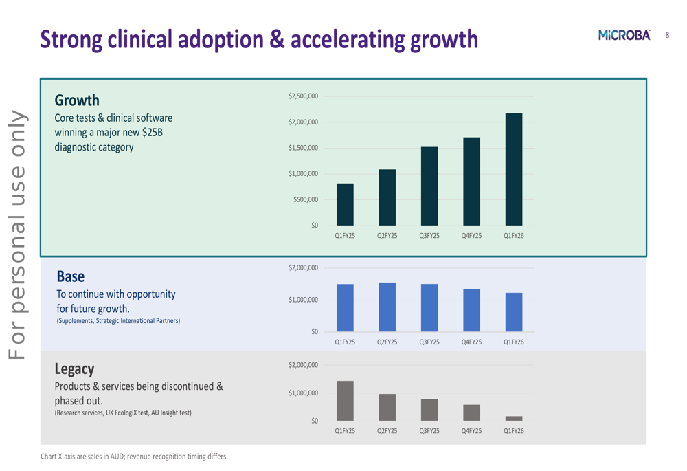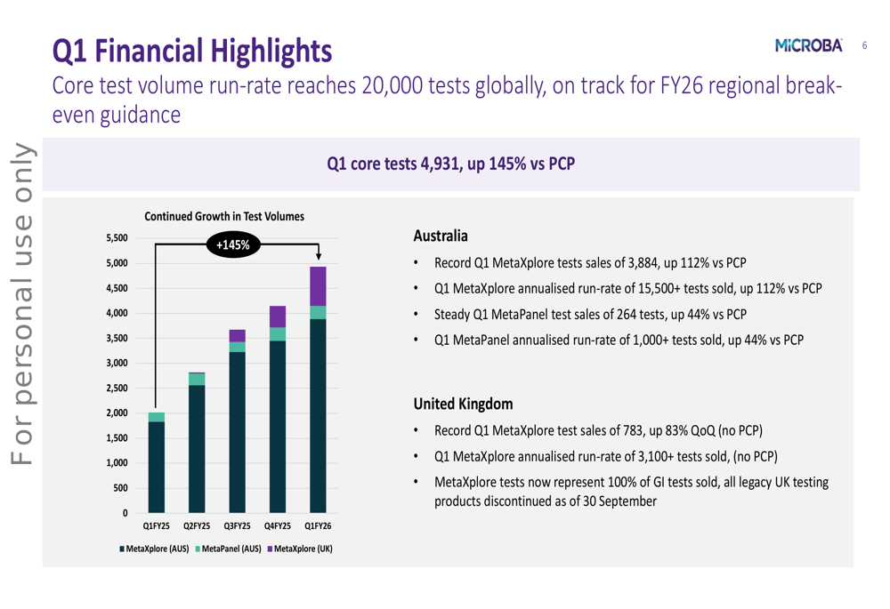 Microba is focusing on expanding its market presence in Australia and the United Kingdom, with both regions showing strong growth in test volumes. In Australia, MetaXplore test sales reached 3,884 in Q1, up 112% versus PCP, with an annualized run-rate exceeding 15,500 tests. The number of ordering clinicians grew 71% to 837.