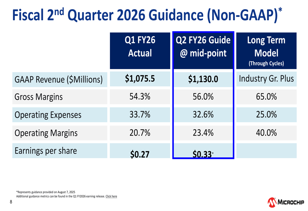 Microchip’s actual Q2 fiscal 2026 results, released after this presentation, showed that the company exceeded its guidance. Non-GAAP earnings per share came in at $0.35, surpassing the forecasted $0.33 by 6.1%. Revenue reached $1.14 billion, slightly above the guided $1.13 billion, representing a 6% sequential increase from Q1.