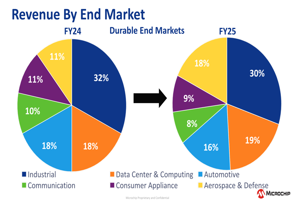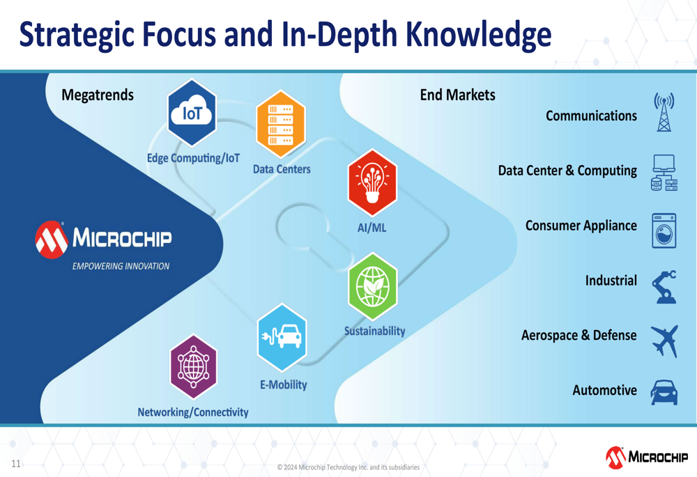 Microchip continues to focus on megatrends including IoT, Edge Computing, Data Centers, AI/ML, E-Mobility, and Networking/Connectivity. The company’s strategic focus spans multiple end markets including Communications, Data Center & Computing, Consumer Appliance, Industrial, Aerospace & Defense, and Automotive.