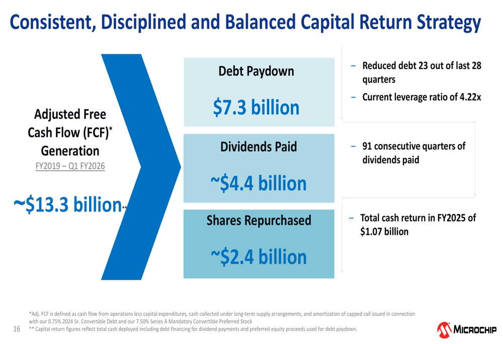 Microchip emphasized its disciplined approach to capital allocation, having generated approximately $13.3 billion in adjusted free cash flow from fiscal 2019 through Q1 fiscal 2026. The company has allocated this cash flow to debt reduction ($7.3 billion), dividend payments ($4.4 billion), and share repurchases ($2.4 billion).