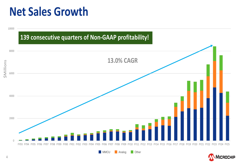 As shown in the following chart of historical net sales growth, Microchip has demonstrated consistent expansion over multiple decades, with particularly accelerated growth beginning around FY15: