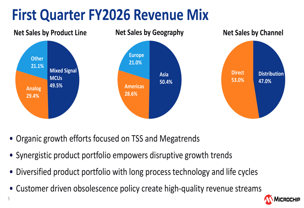 Microchip’s revenue mix for Q1 FY2026 shows a diversified portfolio across product lines, geographies, and sales channels. Mixed Signal MCUs represent nearly half of the company’s revenue at 49.5%, followed by Analog at 29.4%, and Other products at 21.1%. Geographically, Asia continues to be the largest market at 50.4%, with the Americas and Europe contributing 28.6% and 21.0%, respectively.
