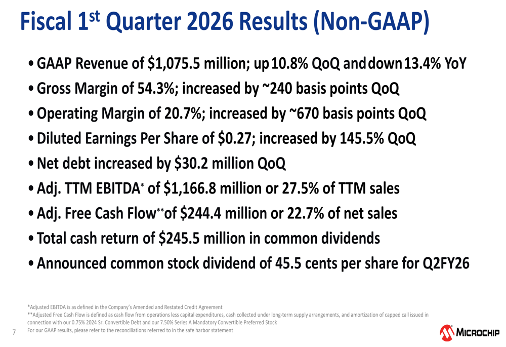 For the first quarter of fiscal 2026, Microchip reported GAAP revenue of $1,075.5 million, representing a 10.8% sequential increase but a 13.4% year-over-year decline. The company achieved significant margin expansion with gross margins reaching 54.3%, an improvement of approximately 240 basis points quarter-over-quarter.
