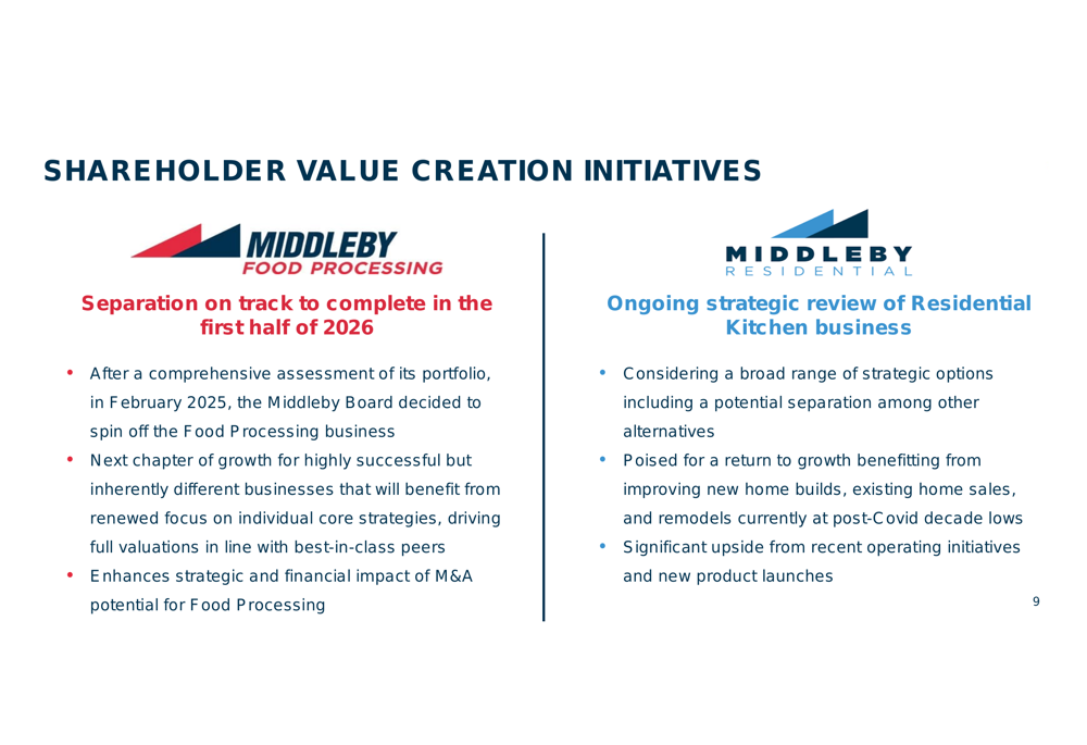 Middleby highlighted several strategic initiatives aimed at enhancing shareholder value, with the most significant being the planned separation of its Food Processing business. The company confirmed this spin-off remains on track for completion in the first half of 2026, following a comprehensive assessment announced in February 2025.
