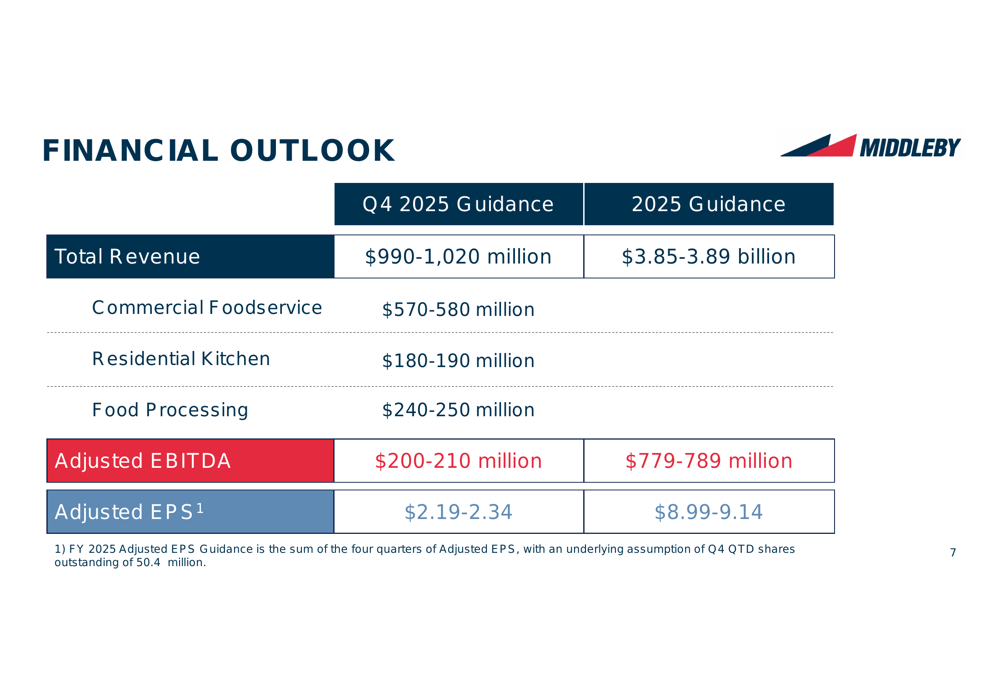 Middleby provided guidance for both Q4 2025 and the full year. For the fourth quarter, the company expects revenue between $990-1,020 million, with adjusted EBITDA of $200-210 million and adjusted EPS of $2.19-2.34.