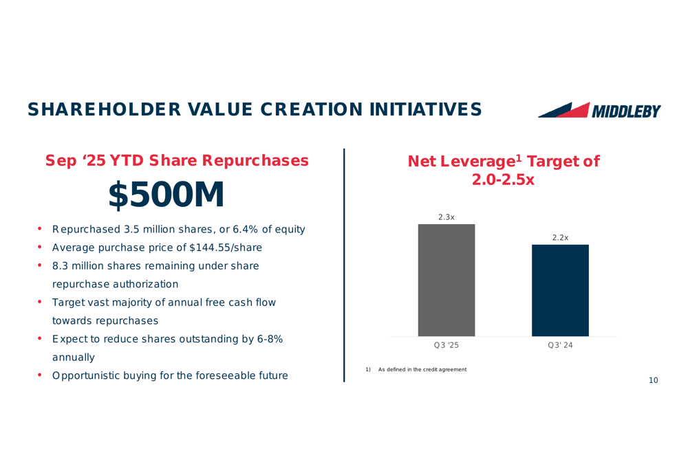 Middleby has been actively returning capital to shareholders through an aggressive share repurchase program. Year-to-date through September 2025, the company has repurchased $500 million worth of shares, representing approximately 3.5 million shares or 6.4% of outstanding equity at an average price of $144.55 per share.