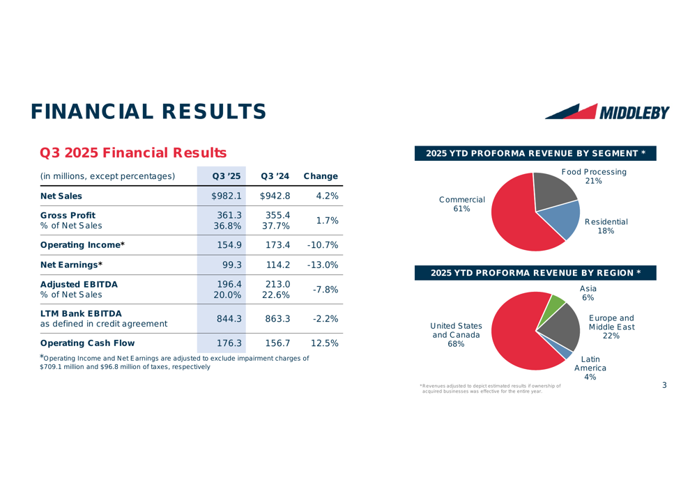 Middleby's Q3 2025 results showed modest top-line growth but declining profitability metrics. The company reported net sales of $982.1 million, a 4.2% increase from $942.8 million in Q3 2024. Gross profit rose 1.7% to $361.3 million, representing 36.8% of net sales.