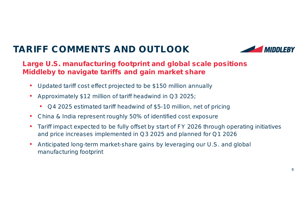 Management emphasized that Middleby's large U.S. manufacturing footprint and global scale position the company to navigate tariff challenges better than competitors. The company expects to fully offset tariff impacts by the start of FY 2026 through a combination of operating initiatives and price increases implemented in Q3 2025 and planned for Q1 2026.