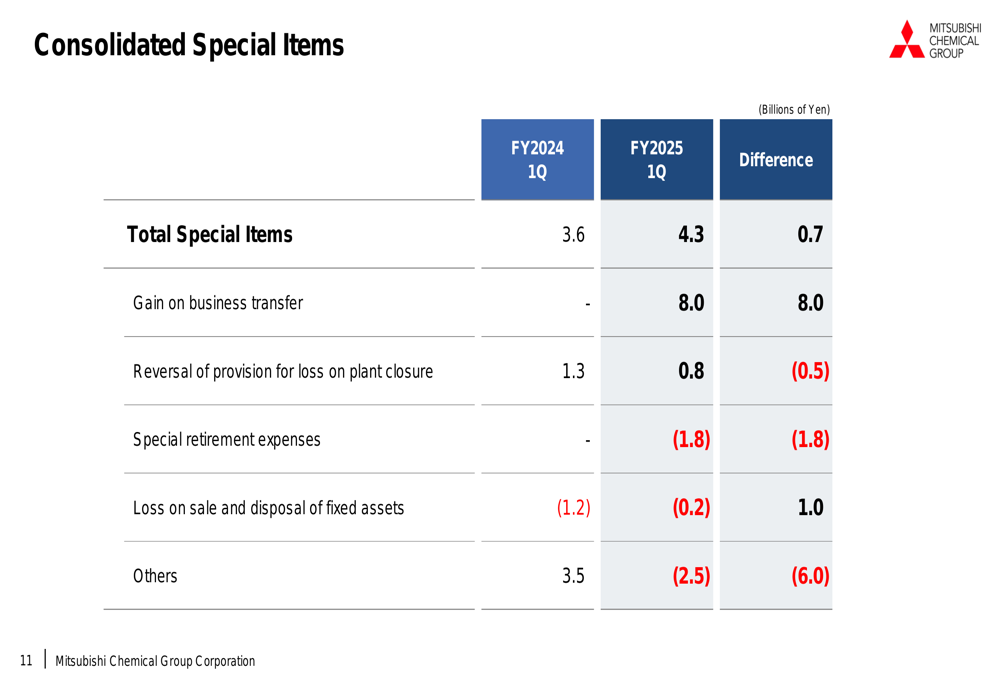 Mitsubishi Chemical’s presentation emphasized its ongoing initiatives for portfolio transformation and profit improvement. The company has implemented significant cost reductions through rationalization of production sites and optimization of plant operations, contributing to the ¥11.5 billion in cost savings reported for the quarter.