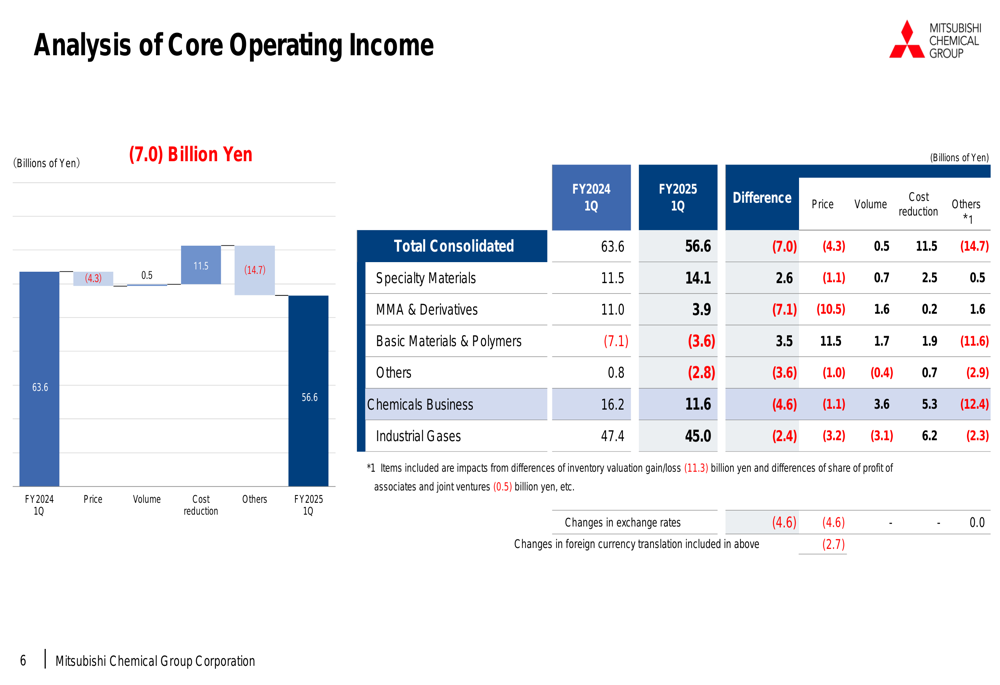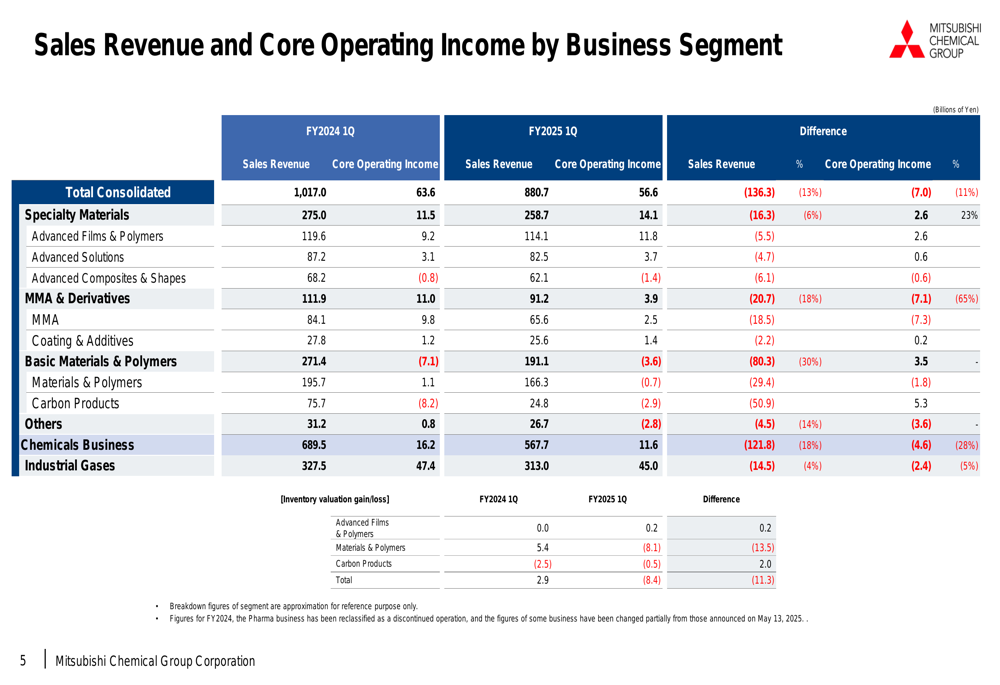 The company’s performance varied significantly across business segments. The detailed breakdown shows that Industrial Gases remained the strongest contributor to core operating income at ¥45.0 billion, while the Chemicals Business reported a profit of ¥11.6 billion, down 28% year-on-year: