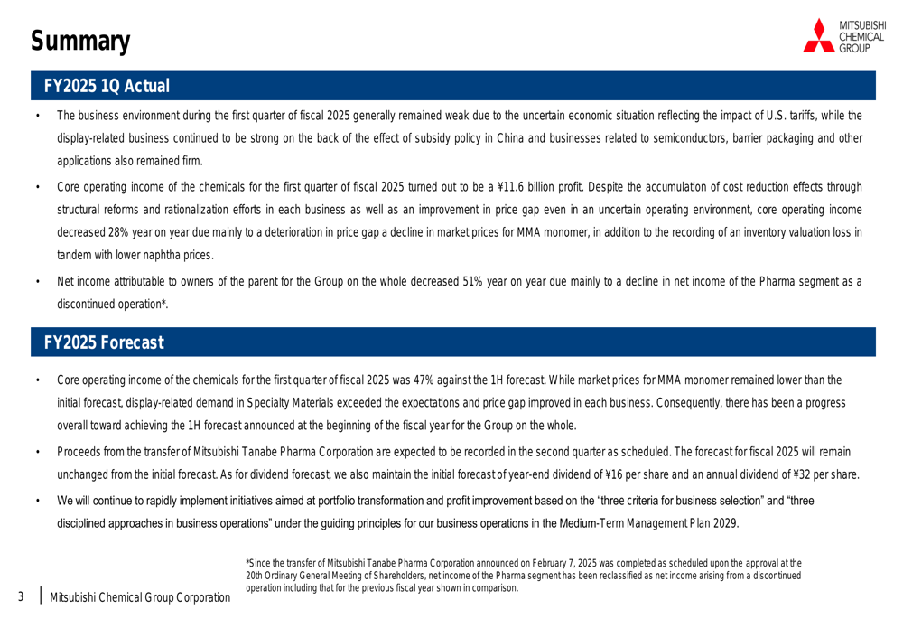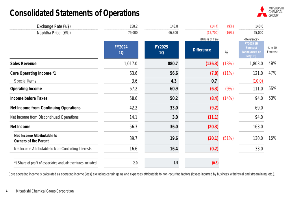 Mitsubishi Chemical reported sales revenue of ¥880.7 billion for Q1 FY2025, representing a 13% decrease from the same period last year. Core operating income fell by 11% year-on-year to ¥56.6 billion, while net income attributable to owners of the parent decreased significantly by 51% to ¥19.6 billion.