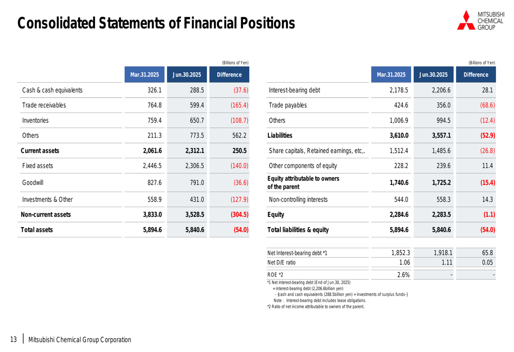 The consolidated statements of financial positions show a slight decrease in total assets from ¥5,894.6 billion as of March 31, 2025, to ¥5,840.6 billion as of June 30, 2025. Notable changes include reductions in trade receivables and inventories, which may reflect improved working capital management: