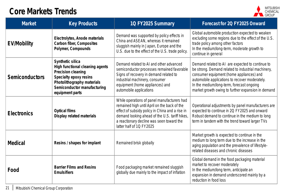 Mitsubishi Chemical provided insights into trends across its core markets, which offer context for both current performance and future prospects. The company noted varying conditions across key sectors, with AI-related semiconductor demand showing strength while other areas face challenges:
