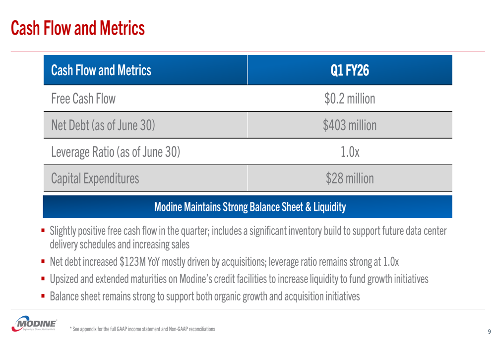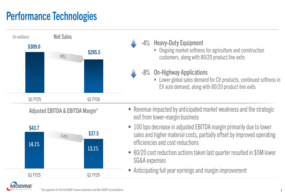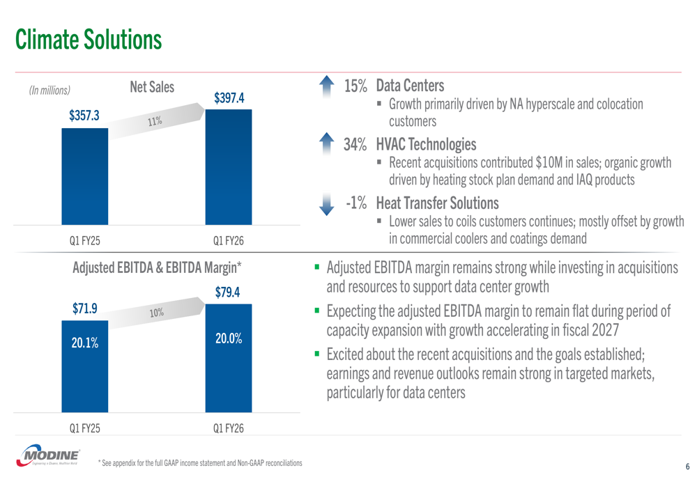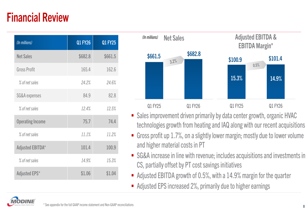 Modine reported Q1 FY26 net sales of $682.8 million, a 3.2% increase from $661.5 million in the same period last year. Adjusted EBITDA reached $101.4 million, slightly up from $100.9 million in Q1 FY25, while adjusted earnings per share rose to $1.06 from $1.04 year-over-year.