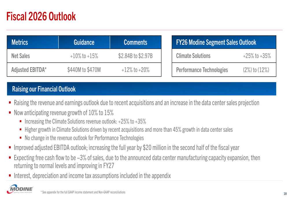 Based on strong performance in Climate Solutions and recent acquisitions, Modine raised its fiscal 2026 outlook. The company now anticipates net sales growth of 10% to 15%, up from previous guidance, equating to $2.84 billion to $2.97 billion. Adjusted EBITDA is projected to reach $440 million to $470 million, reflecting 12% to 20% growth.